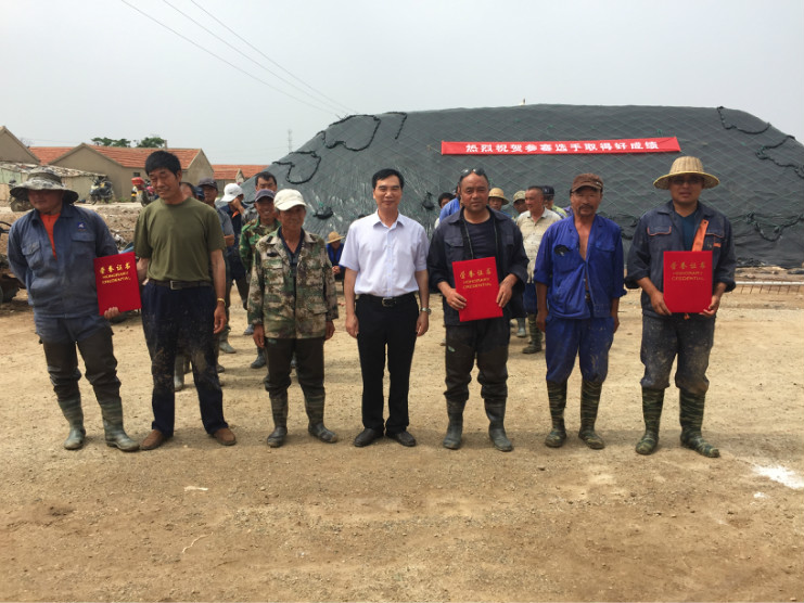 比賽開始前,生產(chǎn)服務(wù)公司經(jīng)理王緒前首先就天溝建設(shè)要求、評(píng)分標(biāo)準(zhǔn)等事項(xiàng)進(jìn)行了現(xiàn)場(chǎng)說明。7點(diǎn)20分,隨著裁判員的一聲令下,比賽正式開始。參賽選手們按照賽前抓鬮序號(hào),迅速投入到比賽中。賽場(chǎng)上,每一組選手都分工明確,澆水、翻泥、踩實(shí)、做埝、整平一氣呵成,大家都表現(xiàn)的極為熟練,充分展示了參賽選手扎實(shí)的基本功。比賽中,三位裁判在比賽場(chǎng)地來回巡查,認(rèn)真記錄每一組參賽選手的勞動(dòng)過程,力求做到公平、公正。9點(diǎn)20分,隨著最后一組選手的工作完成,比賽正式結(jié)束。隨即,三位裁判又根據(jù)比賽過程中的記錄情況結(jié)合最終工程質(zhì)量對(duì)每一參賽小組進(jìn)行綜合評(píng)分。最終,來自埒南制鹽分公司的章保衛(wèi)、高明成榮獲比賽第一名;江海兵、張春連以及尹步松、汪禮兵兩組選手榮獲第二名;新河制鹽分公司朱明、戴繼明,郁雷敏、李正軍,楊春旭、史春海三組選手榮獲第三名。