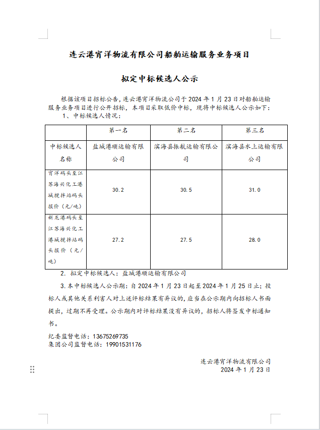連云港宵洋物流有限公司船舶運(yùn)輸服務(wù)業(yè)務(wù)項目擬定中標(biāo)候選人公示