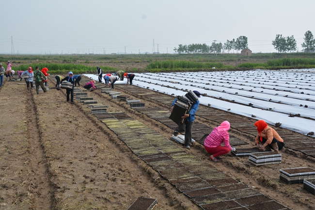 種糧大戶俞正猛正在張羅工人們擺盤育秧。運(yùn)盤、擺盤、覆膜、壘土,工人們或快速或仔細(xì)地高效運(yùn)轉(zhuǎn)著,三輛三輪車前后停在田埂上,車上整齊的擺放著數(shù)以萬盤的暗化苗,這些暗化苗來自生態(tài)種養(yǎng)中心育秧大棚,硬盤里面一層軟盤放入基質(zhì),撒入稻種,在大棚里通過一定的溫度和濕度的科學(xué)管理,出芽后運(yùn)送到各個(gè)田頭。男工負(fù)責(zé)把硬盤在秧板上均勻放好,再由心細(xì)的女工把軟盤從硬盤上拿出擺放在秧板地上,一條秧板擺完,立刻蓋上無紡布薄膜,就地挖土壓住防風(fēng),保護(hù)好秧苗不被曬傷??盏挠脖P運(yùn)到田邊由專人整理回收最后運(yùn)回生態(tài)種養(yǎng)中心。全部擺完以后上好水,一整套工序就算完成。不到一天時(shí)間,一萬多盤秧盤已經(jīng)被工人們?nèi)粩[完。